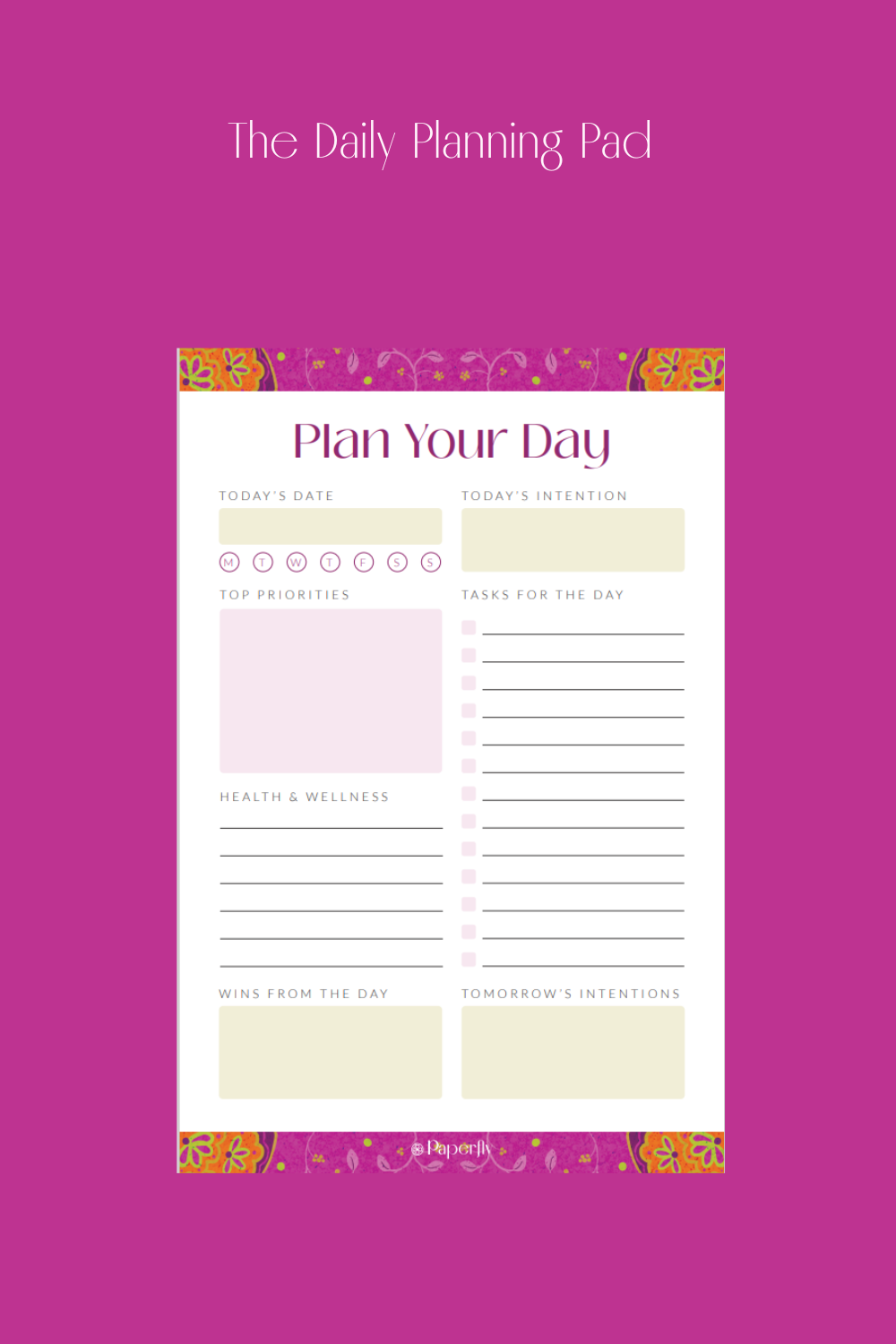 Thoughtfully designed with blocks for all of the important building blocks of your day, including a daily intention, top priorities for the day, all tasks for the day, health and wellness goals and notes, wins for the day, and a short section to plan the following day.